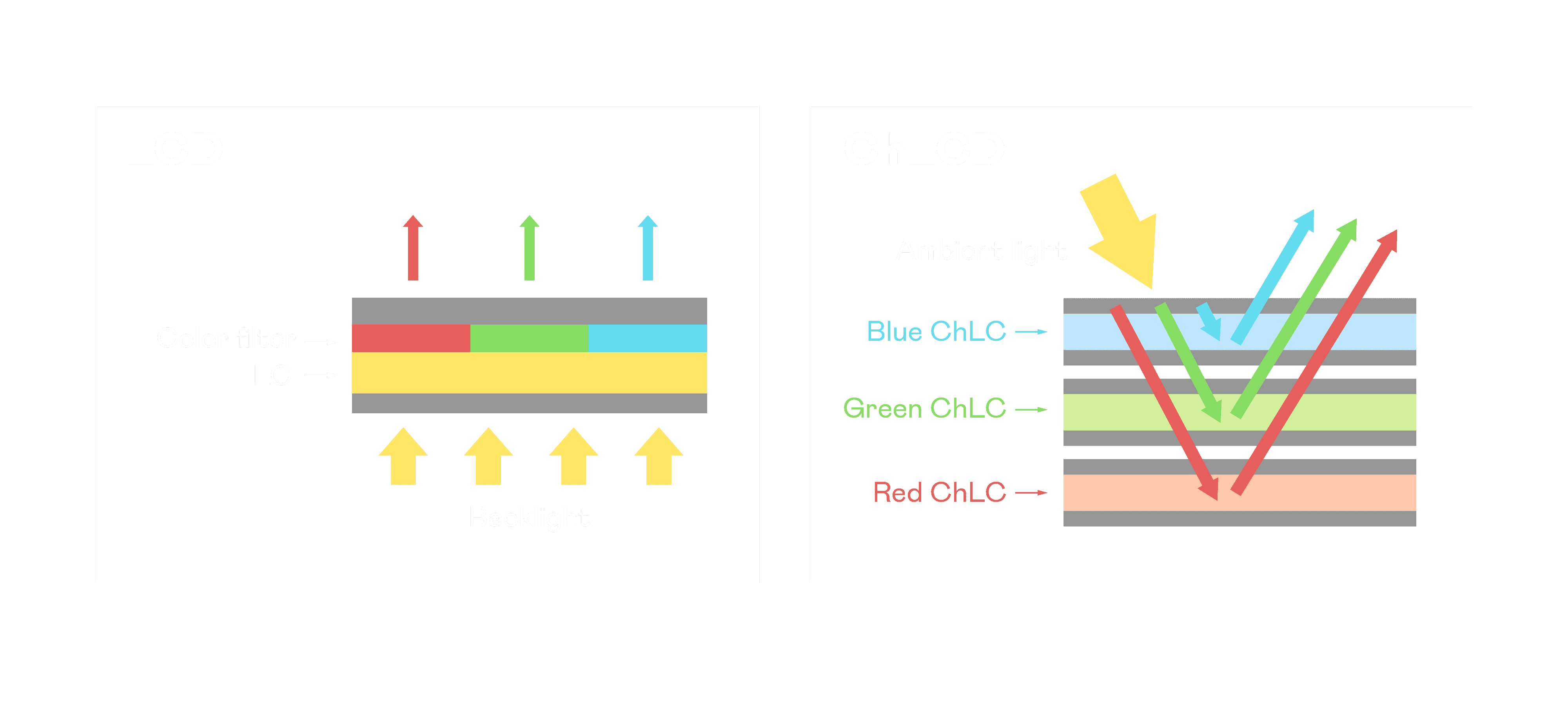 ChLCD 胆固醇液晶就如同纸张一样,,,,透过反射环境光来显示影像,,因此长时间观看不易造成人眼视觉疲劳,,,可达到护眼效果。。当处于户外阳光下使用,,,,LCD 影像容易失真而不易观看,,,,但胆固醇液晶仍可维持较佳的影像品质。。