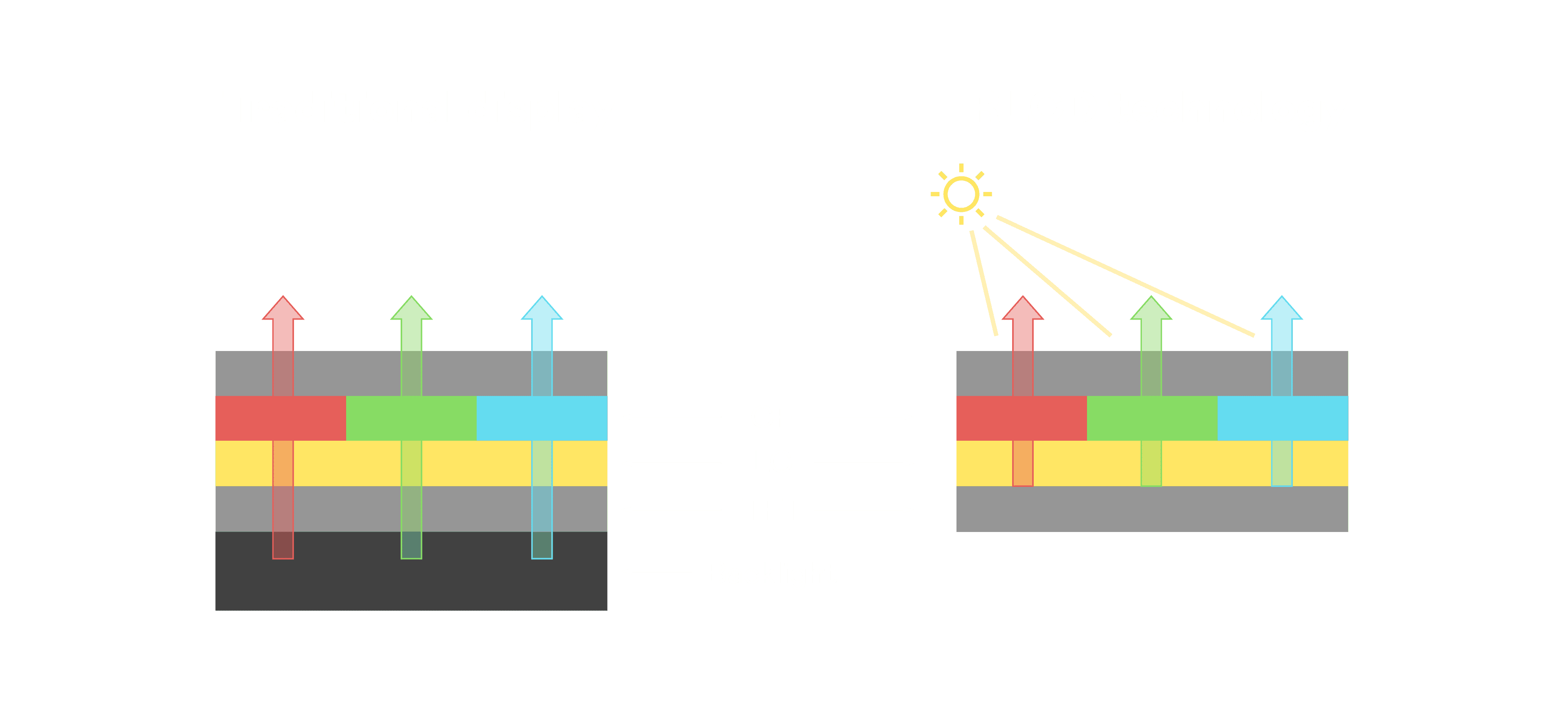 与传统需搭配背光单元的液晶显示相比,,反射式液晶技术不仅更省电、、、、更轻薄,,且即便在艳阳下仍能清晰显示。。此外,,,少了背光单元,,,也大幅降低了 LED 蓝光伤害眼睛的疑虑。。。。